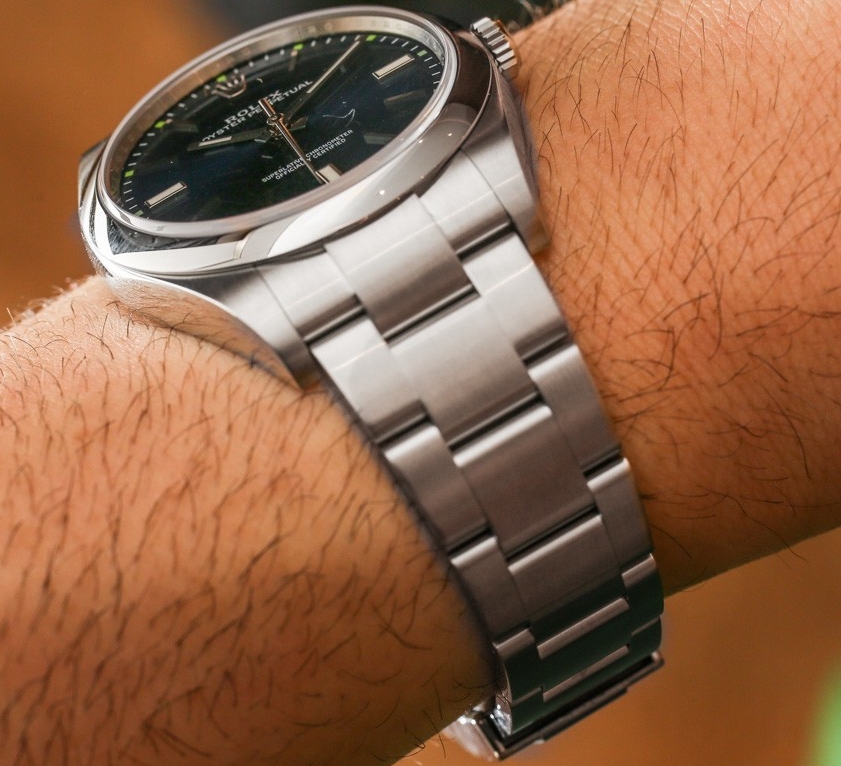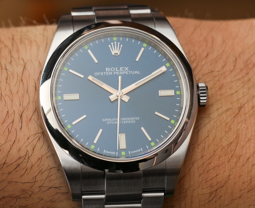 The Rolex Oyster Perpetual (reference 114300) can be had in your choice of three dial colors – dark rhodium, red grape, or blue. If it weren’t for the red grape and blue options, we would forgive you if you were less than enthused by the Rolex Oyster Perpetual. While I’d assume that the grey dial will be popular, it doesn’t have the same character or presence offered by its more lively and colorful siblings. For my tastes, the blue version is the one to have, with a excellent mix of everyday wearability with a certain added charm. It’s still vanilla, but maybe with a few sprinkles on top.Each dial color has its own accent color that flanks the markers with blue accents on the grey dial, red accents on the red grape dial, and green accents on the blue dial. For replica Rolex watches UK with such a reserved and non-embellished overall design, this pop of color is a welcome addition.